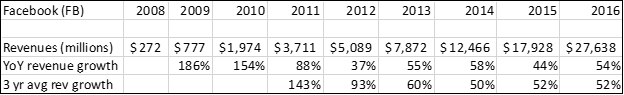Between 2008 and 2016, Facebook grew its revenues anywhere between 37% and 186% annually.