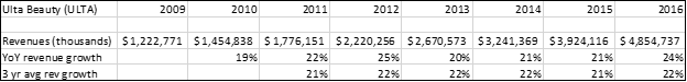 Between 2009 and 2016, Ulta grew its revenues anywhere between 21% and 22% annually.