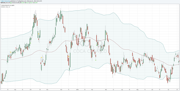 Here we are using daily bars, and we have set the Bollinger Bands to use an 80-period (80 days) look-back.