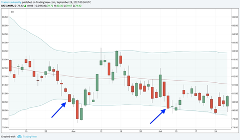 I’ve put 2 big arrows on the chart above to show you the days on which the stock closed below the lower Bollinger Band.